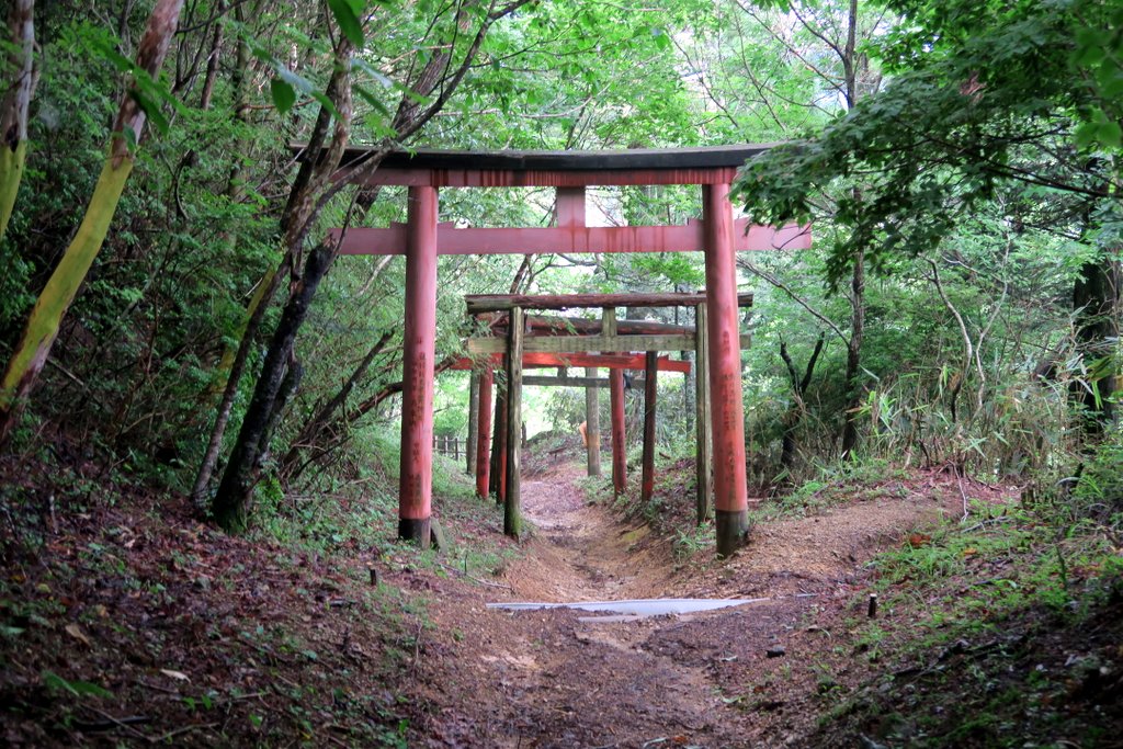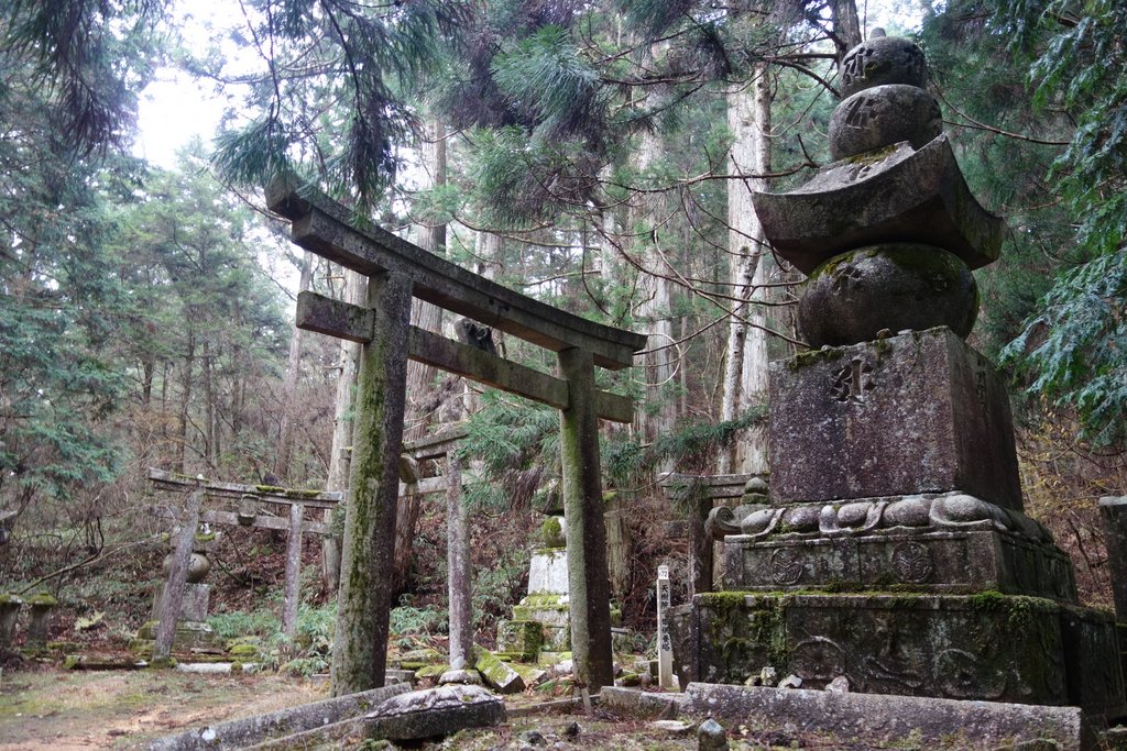 11 От ворот у вас есть два варианта - вы можете идти прямиком в городок, который вырос вокруг храмового комплекса, а можете ещё прогуляться тропинкой через синтоистские ворота Тории. Коя - центр буддизма, но в Японии две религии не исключают друг друга, так что тут есть маленькое подобие оранжевых туннелей Фусими Инари.