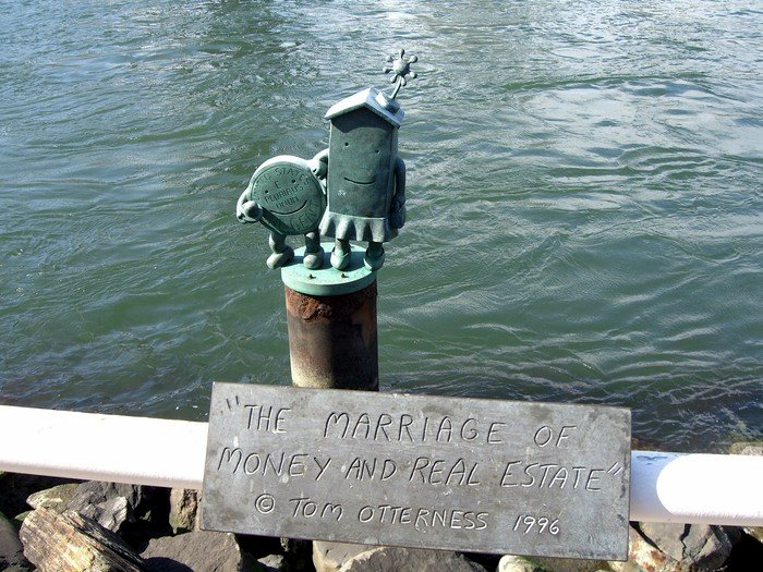 Эти три небольших скульптурных композиции называются "Союз Недвижимости и Денег" ("The Marriage of Real Estate and Money") - их установили здесь более 20 лет назад, в 1996 году:
