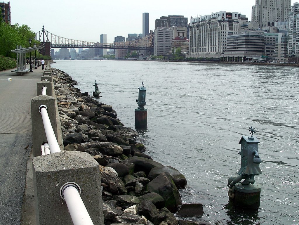 Короче, хочу сегодня показать вам ещё одну умилительную деталь Нью Йорка: эти прекрасные зелёные фигурки стоят в водах Ист Ривер, рядом с берегом Рузвельт Айленда.