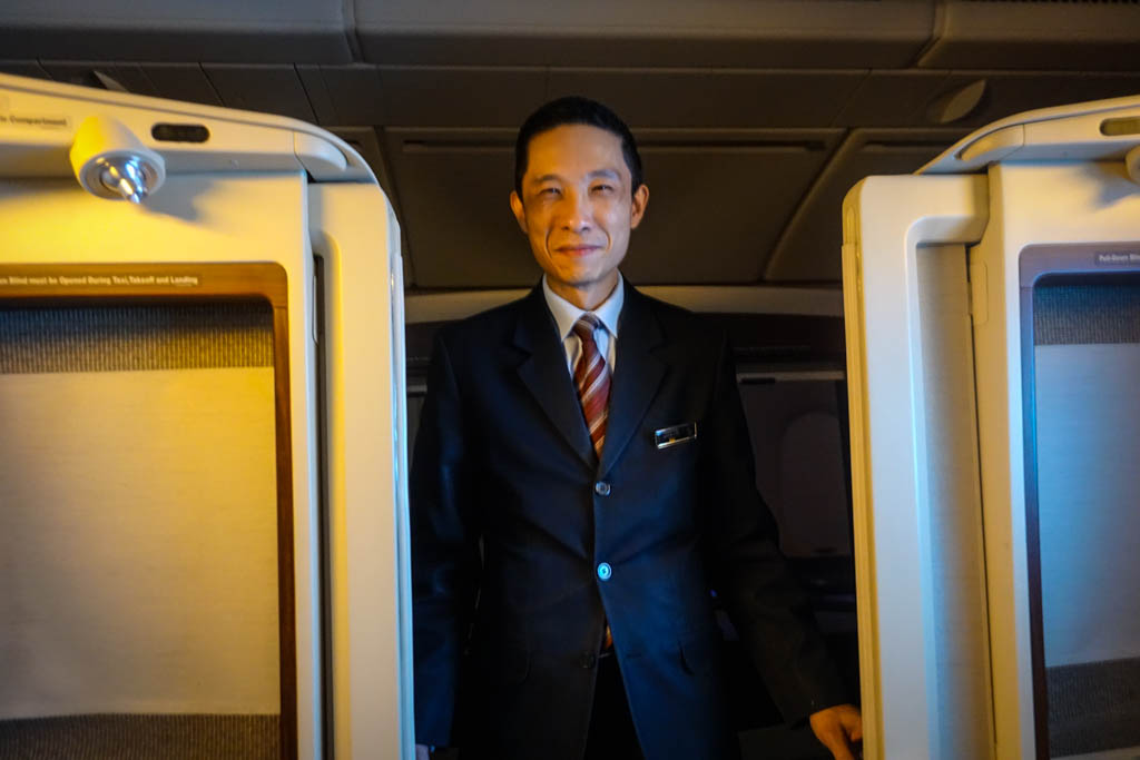 Я думал, что все стюарды одеты одинаково в чёрные пиджаки, и никакой цветовой дифференциации у них нет. Но оказывается, цветной стаж у них отражается полосками на галстуке. Например вот супервайзер в фиолетовом (жалко я этого не знал, когда мы общались):