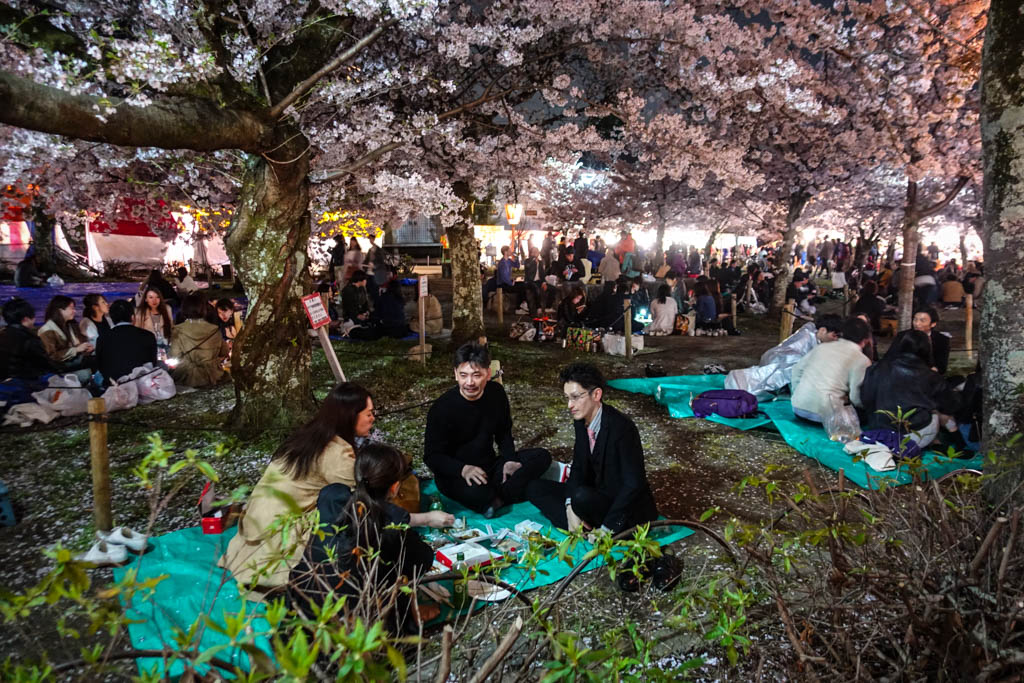 17. Сами же японцы любят наблюдать за сакурой в парках. Они приходят сюда с утра, чтобы занять места для пикников "ханами". Это прекрасная традиция собирает большие весёлые компании.