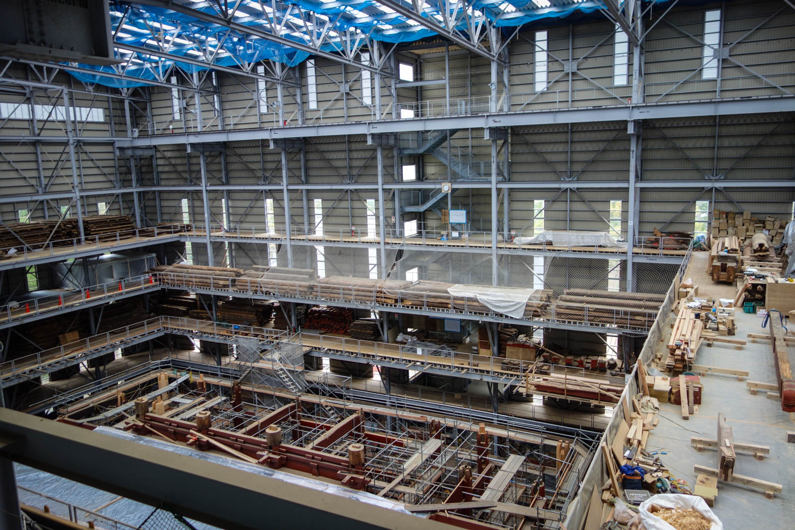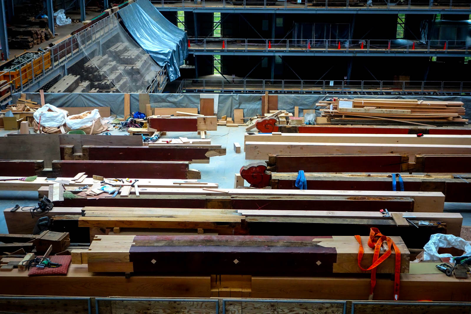 Внутри этого ангара, по периметру, строят несколько галерей, потом аккуратно разбирают храм на брёвна и доски. Главные несущие колонны тоже аккуратно снимают.