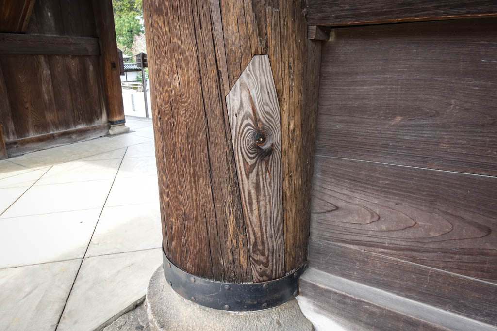 Там, где в дереве находят слабые места, их заменяют, так, чтоб максимально сохранить старое дерева. Получается такого рода 3Д-паззл, в котором кусок нового дерева должен безупречно подойти в то место, которое занимал испортившийся кусочек. Храм - может и не доски, но доски храма нынче не принято просто так выкидывать и заменять целиком. Во время реставрации японцы стараются максимально сохранить "подлинные" материалы.