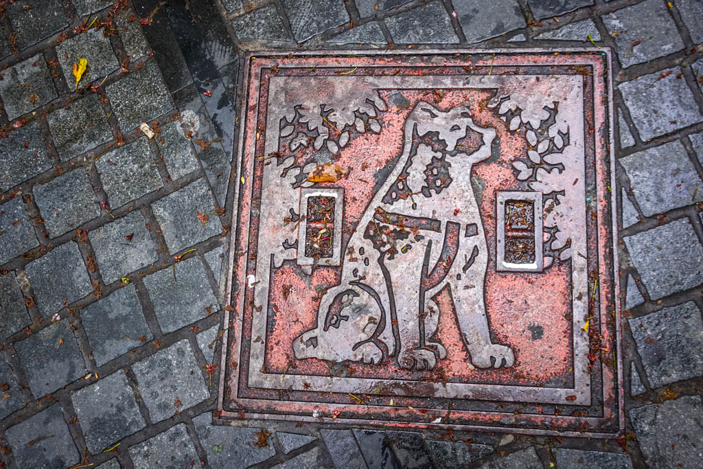 3. Ещё один такой район - Сибуя, которую я упорно называю "Шибуя" вопреки правилам транслитерации Поливанова. Так вот, символ Шибуи - памятник собаке Хачико, пример верности своему хозяину. Оказывается прямо рядом с памятником есть квадратные люки с изображением известной собачки! А я раньше и не замечал этого!
