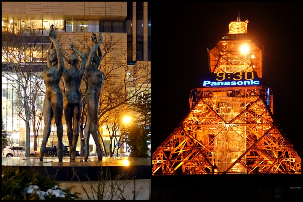 22. Слева - скульптура голых девушек. Напомню вам, что такие голые девушки по всей Японии встречаются (у меня их отдельная коллекция, может и её продолжить?..) А справа - известная в городе телебашня.