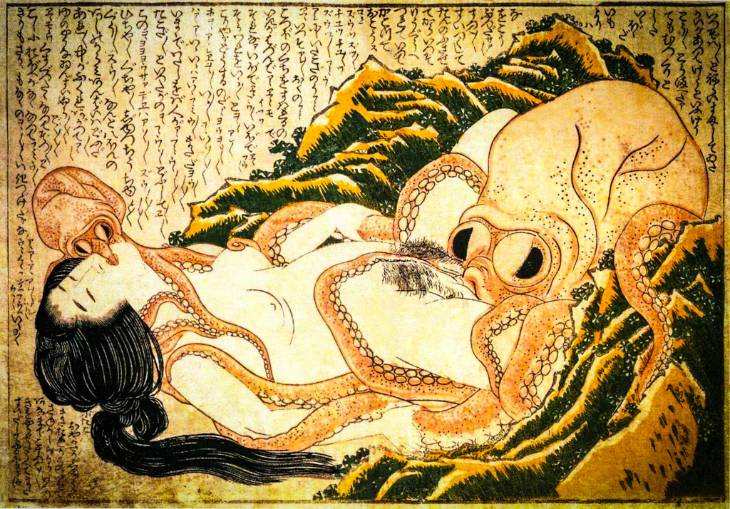 А ещё, у японцев есть целый поджанр эротики со щупальцами, который используют для того, чтоб показать половой акт, не изображая при этом мужского полового... ну вы сами знаете чего. Я вам таких показывать не буду (сами можете нагуглить "tentacle porn"), скажу лишь, что это тоже не новая идея для японцев. Вот ещё один рисунок того-же Хокусая, тоже двухсотлетней давности. Называется он "Мечты рыбачки":