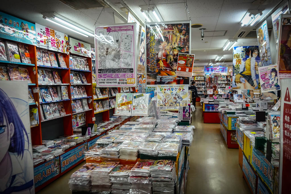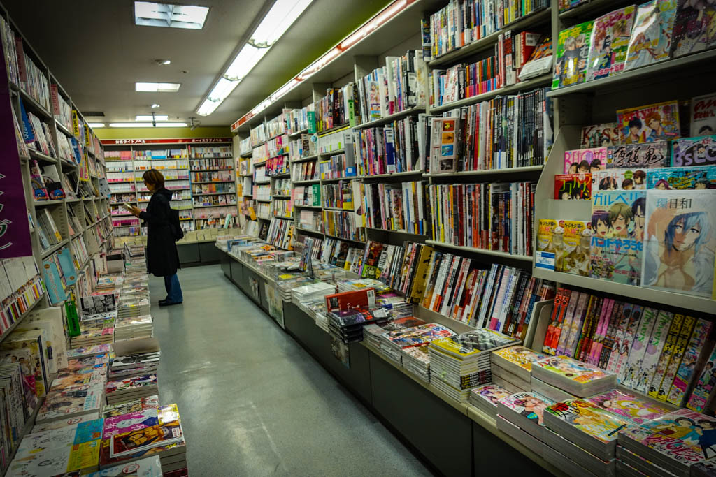 Вот пожалуйста, целый магазин полный Хентая. Ряды полок идут вдоль стен, и посередине тоже стопки выпусков.