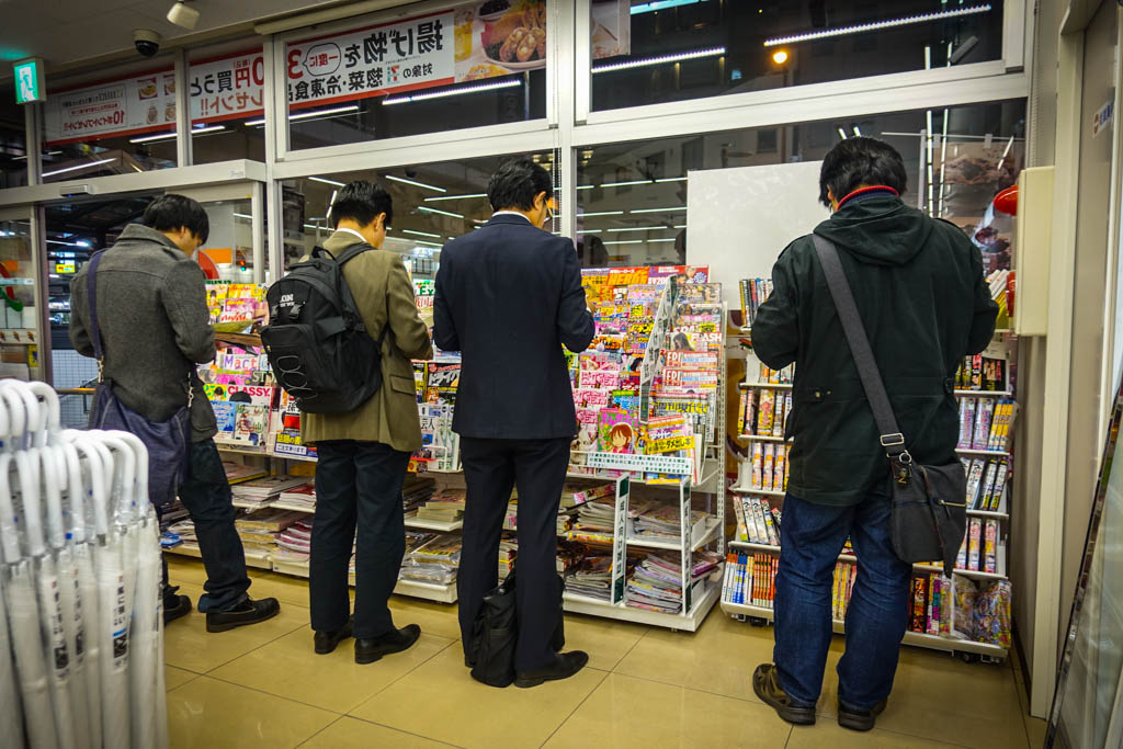 В углу таких магазинов расположена полка, где выставлены различные журналы. Большинство из них - обыкновенный глянец. Мода, хозяйство, спорт... Есть тут и комиксы. У японцев считается абсолютно нормальным подойти и начать листать их, почитывая прямо в магазине (а потом не купить).