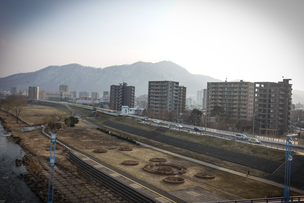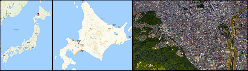 1. Саппоро находится в центральной части Хоккайдо, это самый северный из крупных городов Японии. Он находится на равнине окружённой горами. Само название "Саппоро" взято из языка айнов, местных племён, которые обитали в этих краях сотни лет. "Сат поро пет" на их наречии означает "великая сухая река" - именно так называли они реку Исикари, которая протекает на севере от города. А в его центре течёт река поменьше, Тоёхира - она на спутниковом снимке справа.