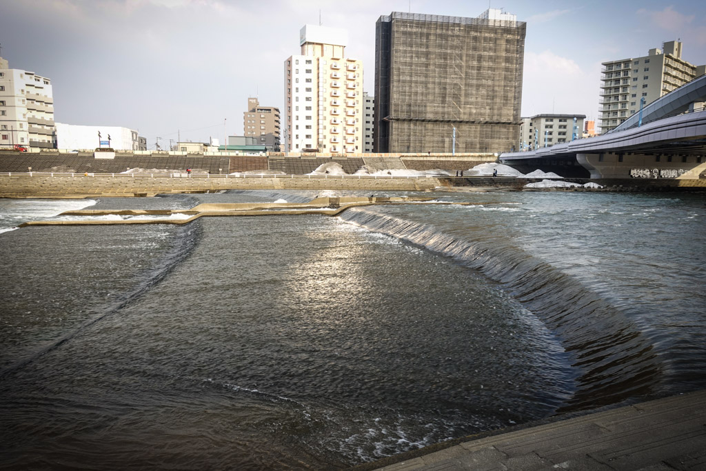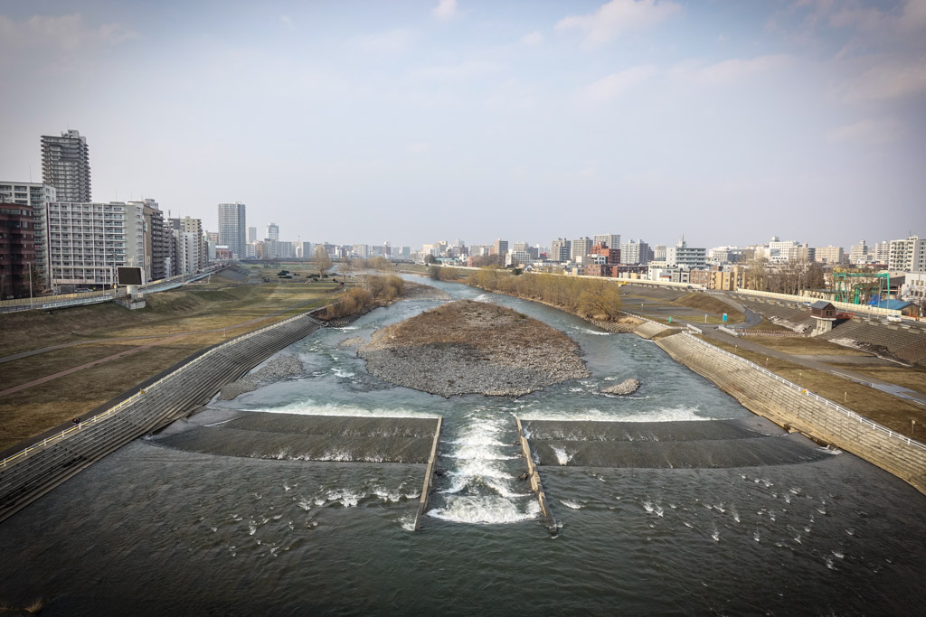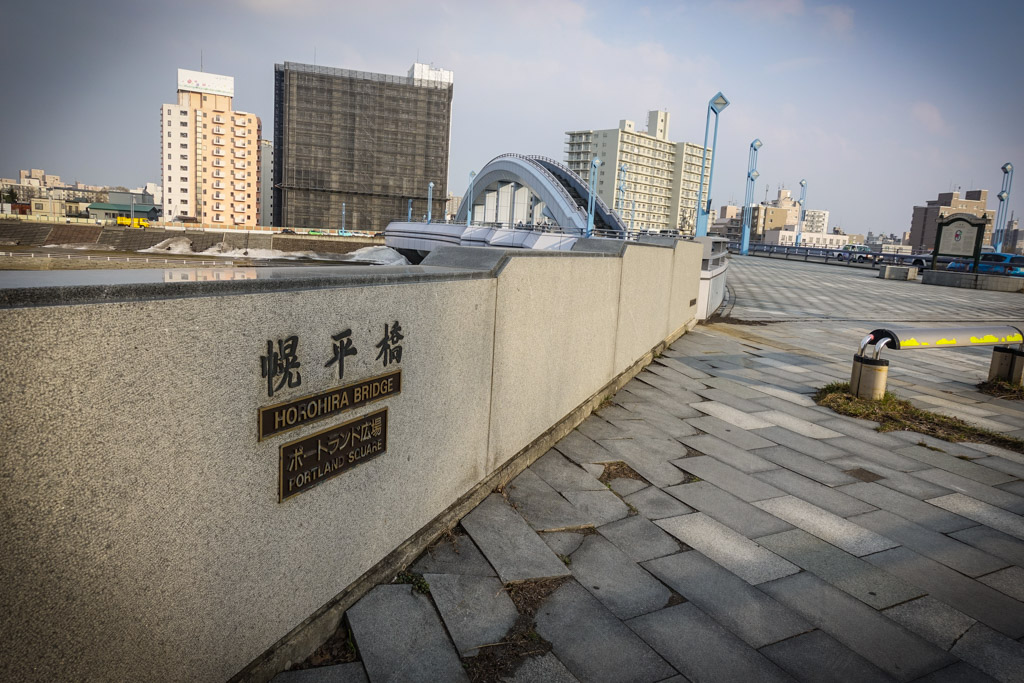 19. Вот он, сам этот мост. Когда я увидел реку на карте, я решил, что обязательно надо до неё дойти, хоть она и находится немного в стороне от центра. Я рассчитывал увидеть здесь набережную на подобии той, что проходит вдоль реки Камо в Киото, которую я считаю лучшей набережной в мире. Но, как оказалось, тут в Саппоро всё по другому.