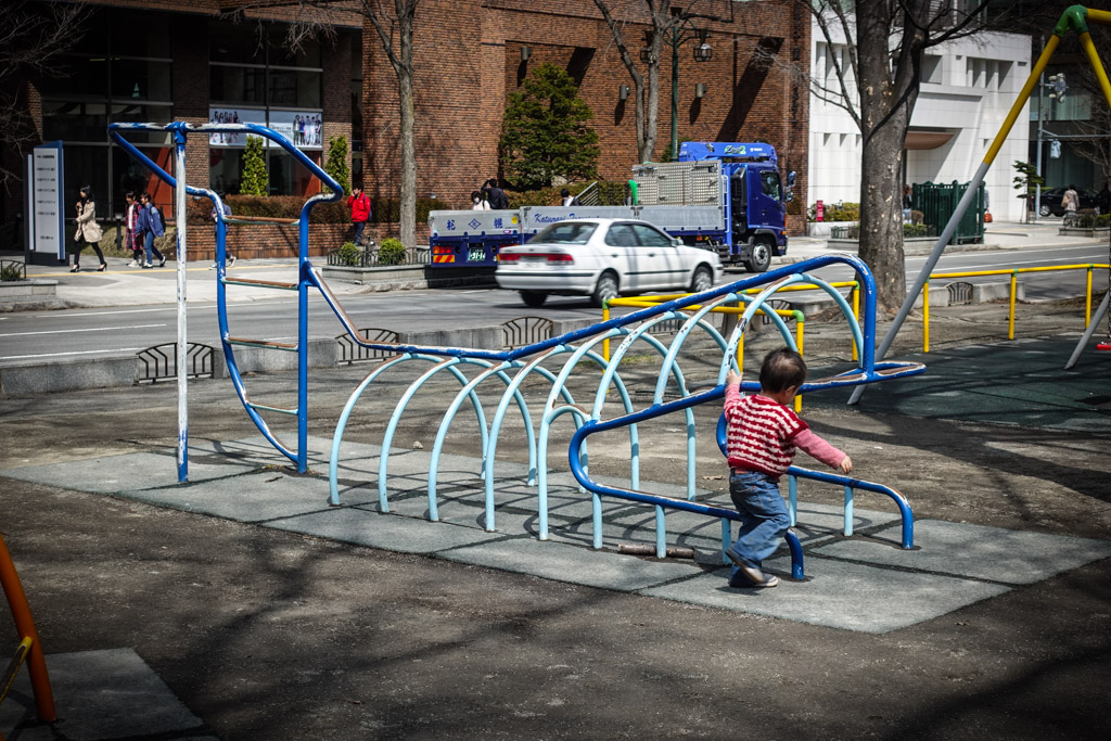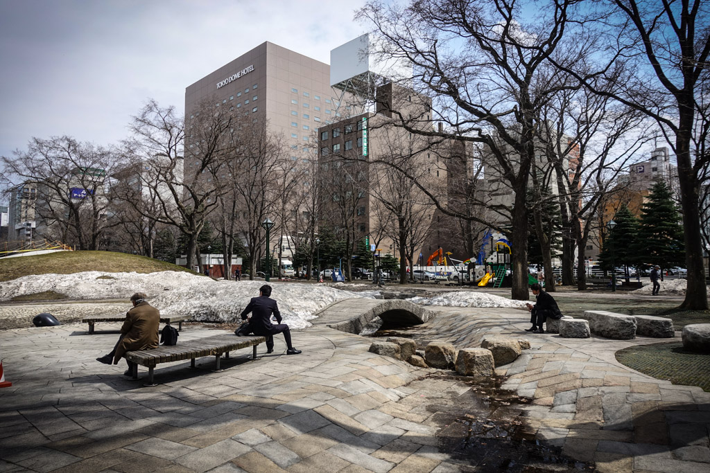 38. Мы были в Саппоро в середине апреля, и хотя тротуары были уже очищены от снега, в парках на земле до сих пор лежали немаленькие сугробы. Ночные температуры в это время года часто опускаются до нуля. Думаю, приедь мы на пару недель раньше, тут была бы зимняя сказка. Жаль только, что в городе почти нет классической японской архитектуры, так что если вам хочется увидеть классическую японскую зиму, за этим лучше ехать в горные деревушки на Хонсю.