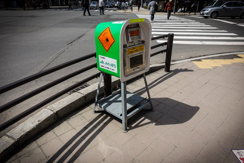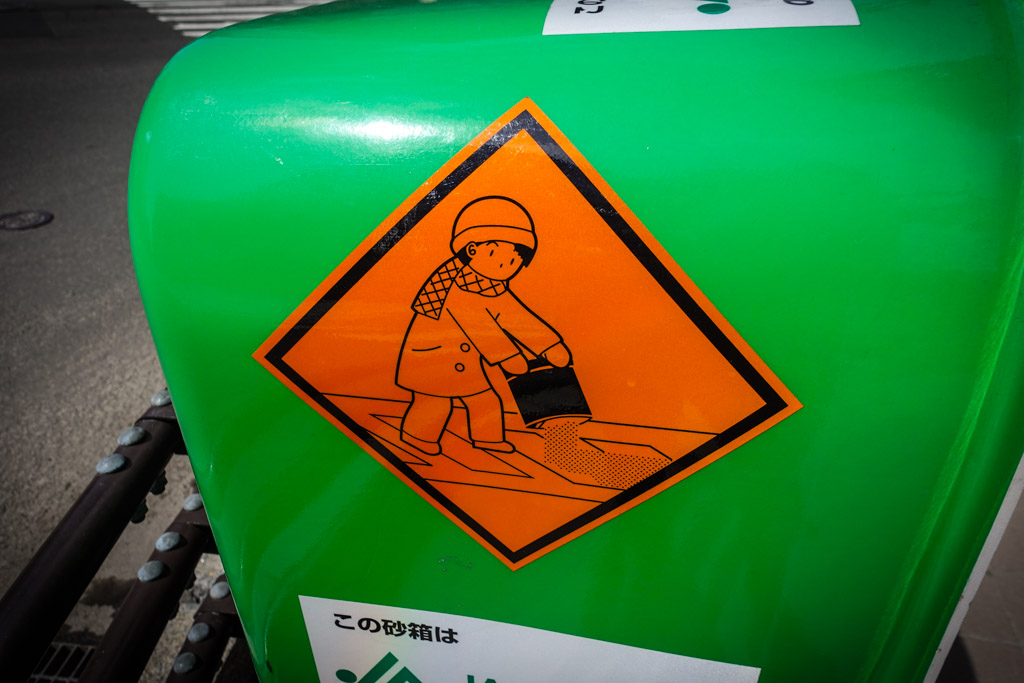 36. Так как тут северный климат, зимой выпадает много снега. В отличии от центральной Японии, снег здесь никакая не редкость. Сугробы лежат по несколько месяцев, а тротуары превращаются в утоптанные скользкие поверхности. Поэтому на тротуарах в центре стоят вот такие ящики с гранитной крошкой. Это специально раздробленный сыпучий камень, где каждая "крупинка" около 5мм в диаметре.