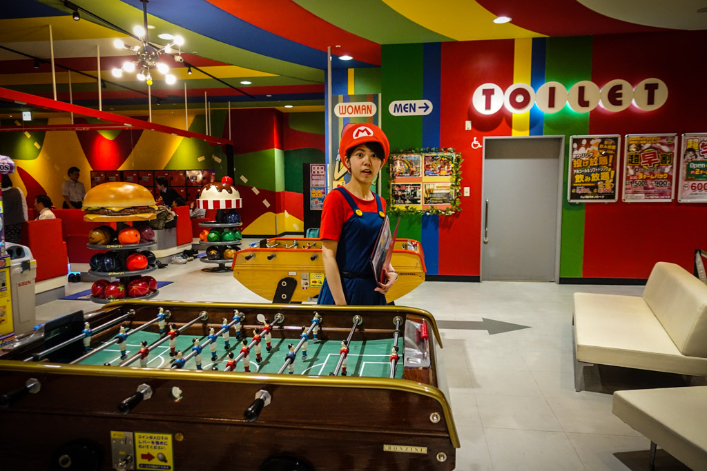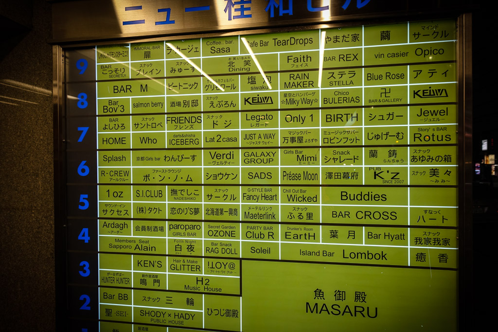 51. Плюс в том, что можно подняться в бар на последнем этаже, и наслаждаться оттуда видом. Но есть и минус: почти каждый бар кроме платы за выпивку и еду берёт ещё и деньги за вход. Это может быть от пятисот до трёх тысяч иен, так что ходить из одного заведения в другое получается накладно. Но и долго заседать в одном тоже неинтересно.