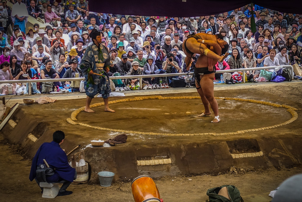 10. На арене уже стояло несколько дюжин борцов и по очереди схватывались друг с другом в качестве разминки. Для тех, кто не в курсе, цель поединка сумо заключается в том, чтобы повалить противника (это происходит крайне редко), или вытолкнуть его за рамки ринга. Кто первым выступил, тот и проиграл.