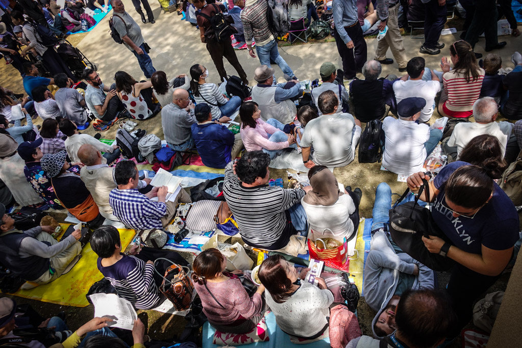 9. Одним глазком не пришлось! Обойдя здание, и пройдя небольшой осмотр, мы (бесплатно!) оказались перед вот такой ареной, вокруг которой собралась уже изрядная толпа зрителей, в ожидании чего-то большого. Кажется, это мы удачно зашли! Оказалось, что по наводке доктора-трамписта, мы пришли в святилище военных преступников как раз в тот день, когда тут проводился день бесплатных показательных схваток сумо!