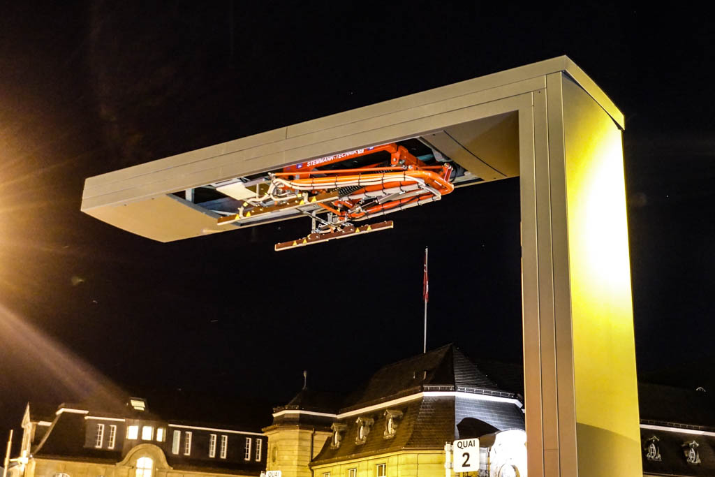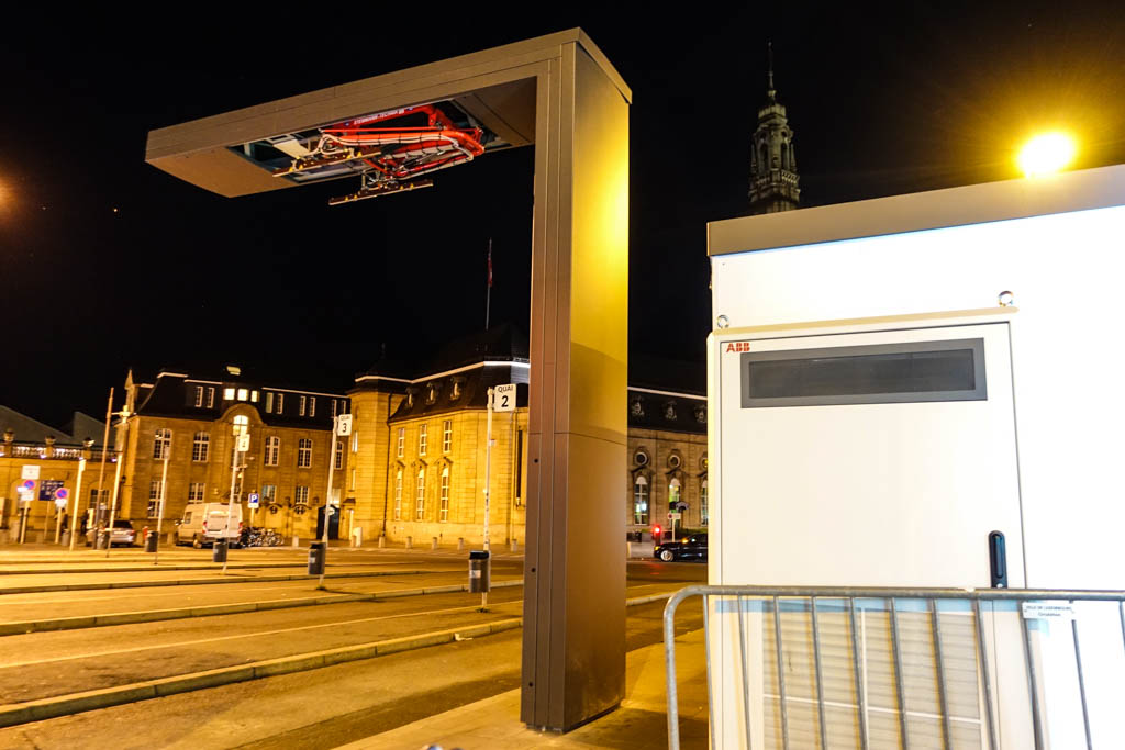 Это действительно электрические зарядки для общественного транспорта, произведённые компанией ABB. В феврале этого года в Люксембурге поставили две таких штуки на привокзальной площади, где заканчиваются многие автобусные маршруты.