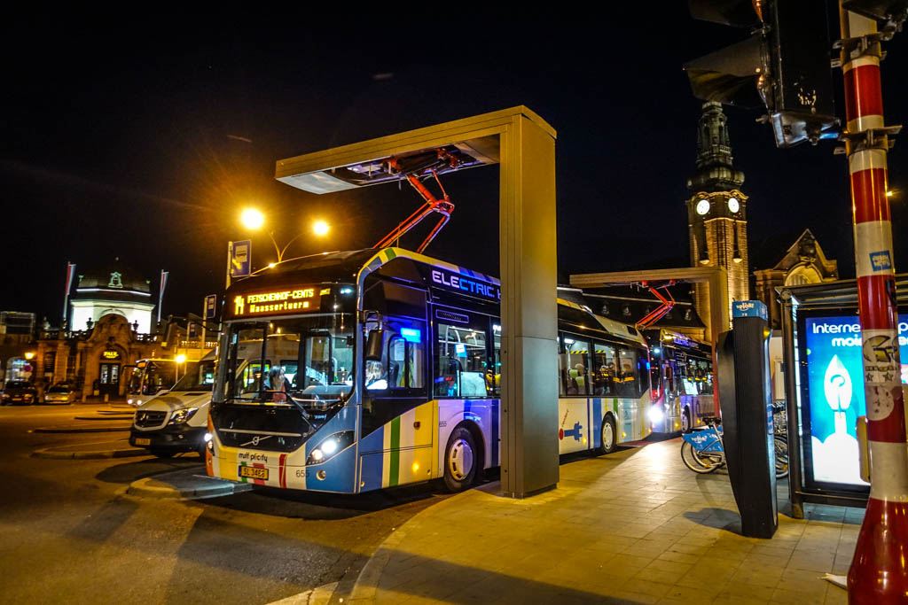 Правда полноценных электробусов в городе до сих пор нет: одновременно с этими зарядками власти запустили пять электро-дизельных гибридных автобуса Volvo. Подзарядка батарей происходит после окончания каждого маршрута, автобус подъезжает под это Гэ, и контактный элемент опускается ему на крышу. Так он и стоит 5-10 минут, перед тем, как начать новый маршрут.