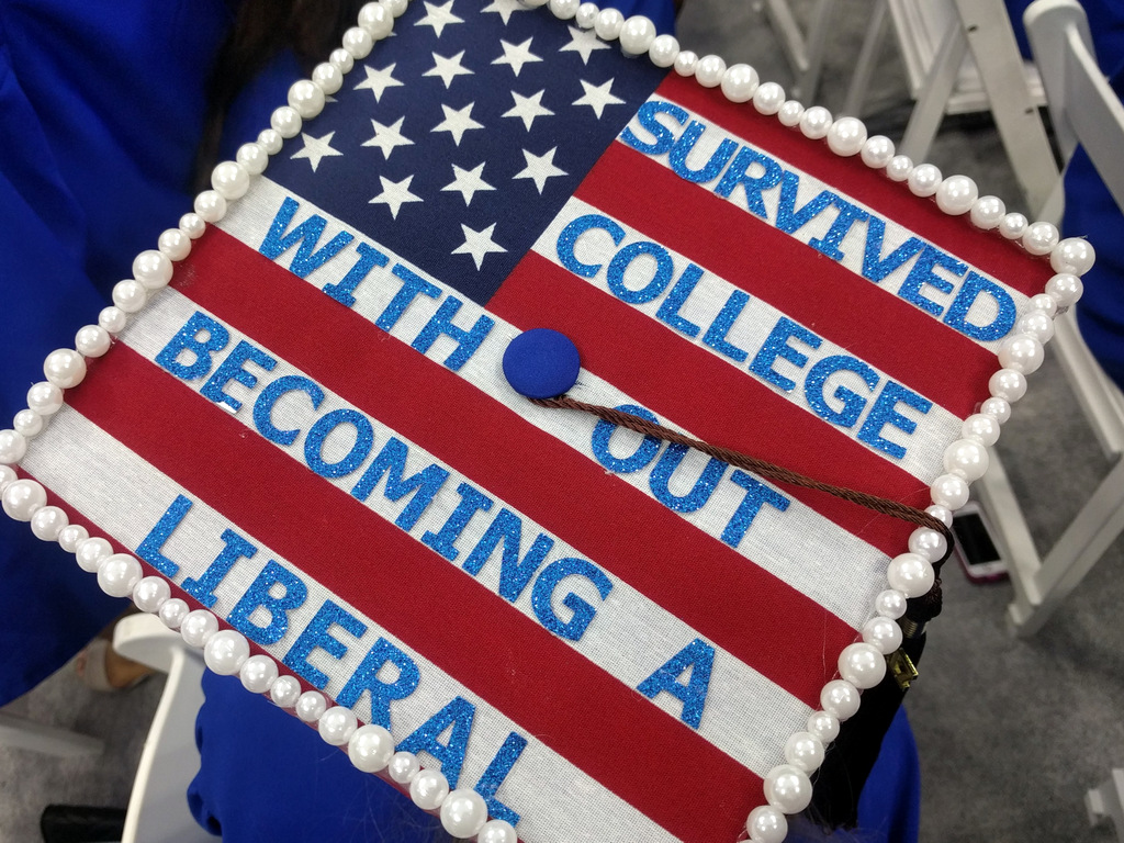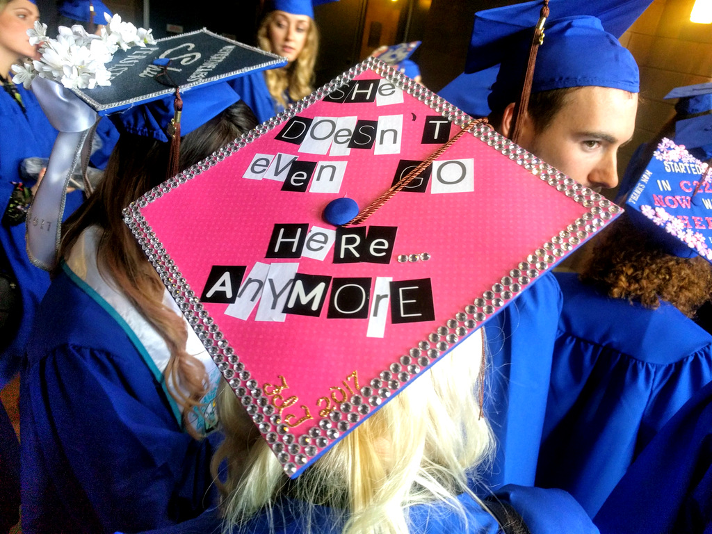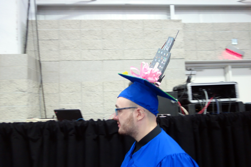 1. Много-много лет назад (ещё XX век был!), когда я закончил универ, я уже на выпускной церемонии понял, что все мои товарищи присобачили к шапочкам что-то прикольное (хотя не настолько, как некоторые из вариантов ниже - всё же мы программистами были!) А и меня не было ничего, кроме программы выступлений, и часа времени. В итоге, я из этих сподручных средств всё же смастерил для своей шапочки буквы "СССР". Видно, ничего интересней или оригинальней мой 19-летний ум придумать не смог. Сейчас конечно стыдно немного за это, но, из песни слов не выкинешь. Что с меня взять то, я тогда и русский язык уже почти позабыл.