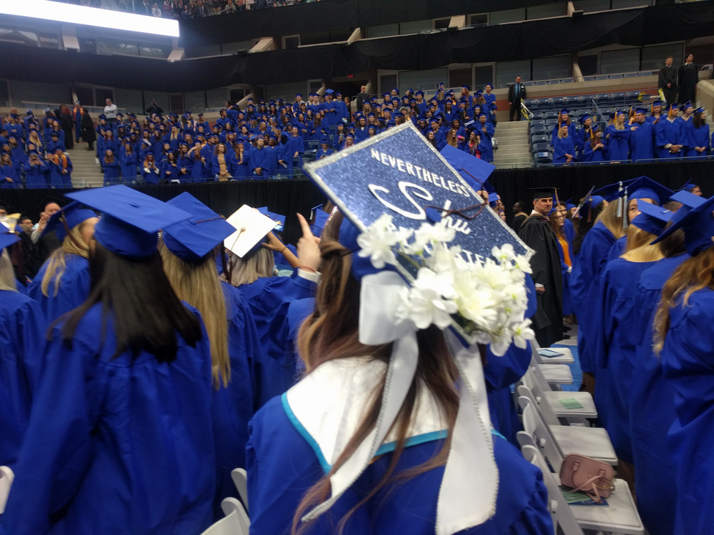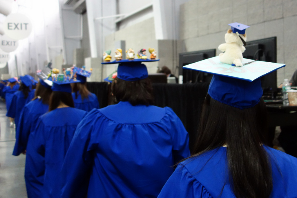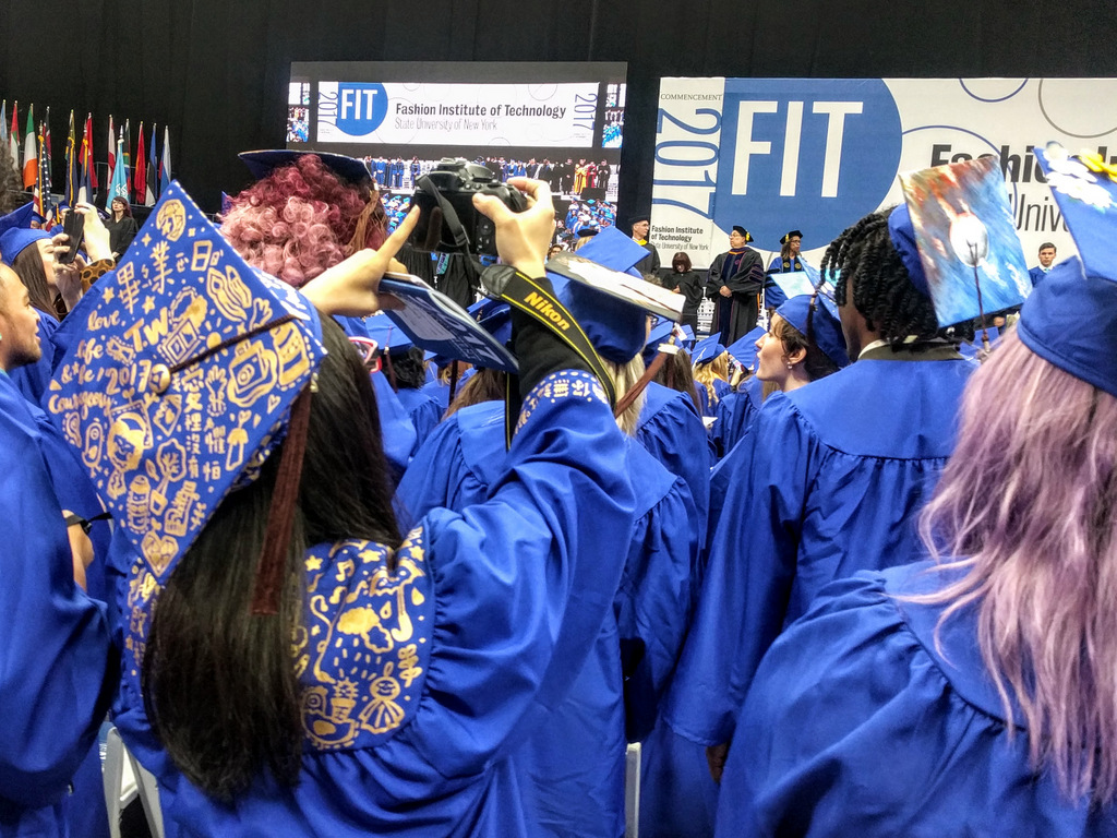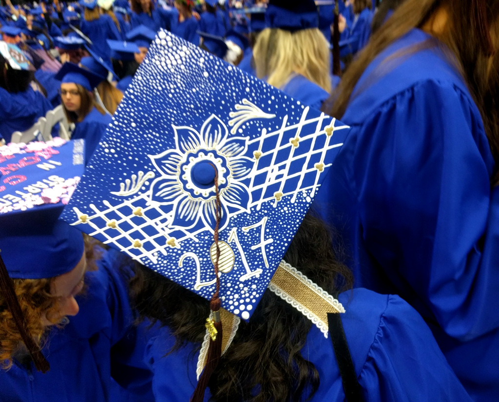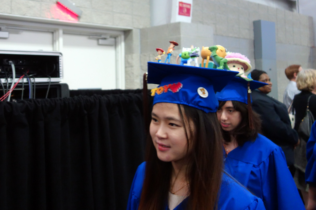 В американских и прочих западных ВУЗах есть такая традиция - выпускники надевают квадратные шапочки с кисточками, на которые закреплён год их выпуска (шапочки иногда по-русски называют "бонетами"). Именно на такой церемонии мне довелось побывать на днях, когда Тоня закончила учёбу, и получила диплом дизайнера по интерьерам. Но есть ещё одна традиция - студенты, особенно в творческих специализациях, часто разукрашивают верх этих шапочек на свой оригинальный манер.