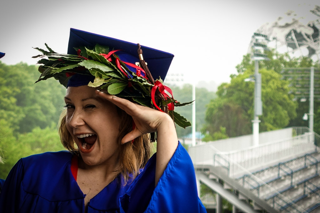 2. Может некоторые из вас помнят Кристину? Она тоже получила диплом, вместе с Тоней. Кристина много лет прожила в Италии, и в соответствиями с традициями этой страны, добавила к своей шапочке самый настоящий лавровый венок - такими в древнем Риме почетали Цезарей! Такой венок у нас в Нью Йорке достать не просто - Кристине семья везла его прямо из Италии, а потом ещё неделю он отлёживался в холодильнике, чтоб листья не испортились. Молодец Кристина!