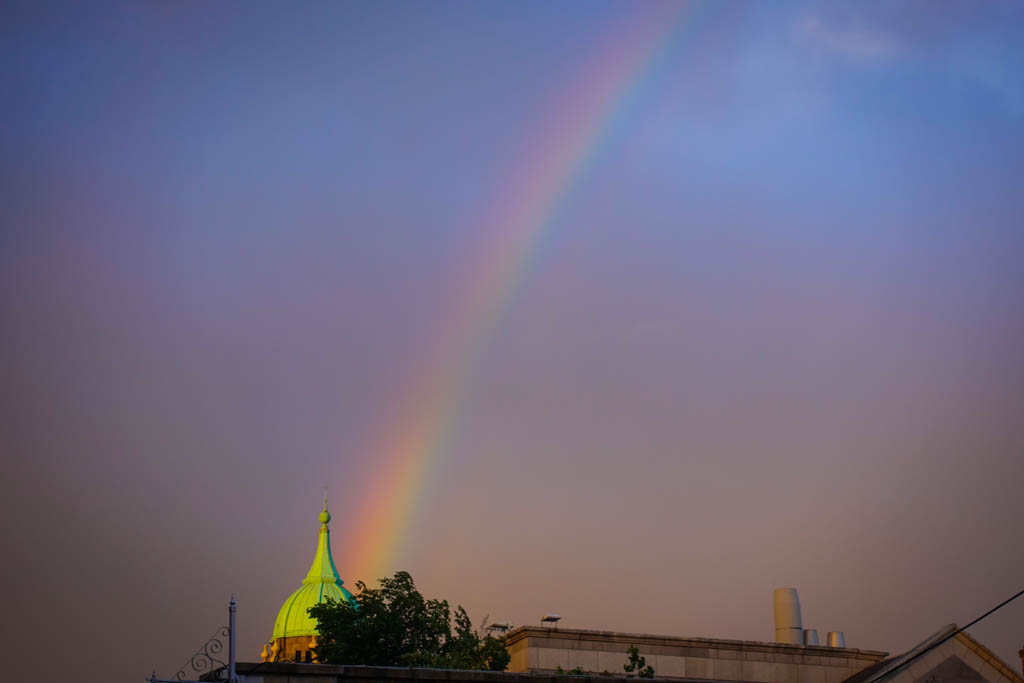 1. Кстати, похоже, где-то недалеко всё же шёл дождь, так как в небе появилась радуга. Согласно ирландской легенде, волшебные гномы-лепреконы прятали горшки золота на конце радуги. Короче, интересно, что это за здание с зелёной крышей... Может кто знает?
