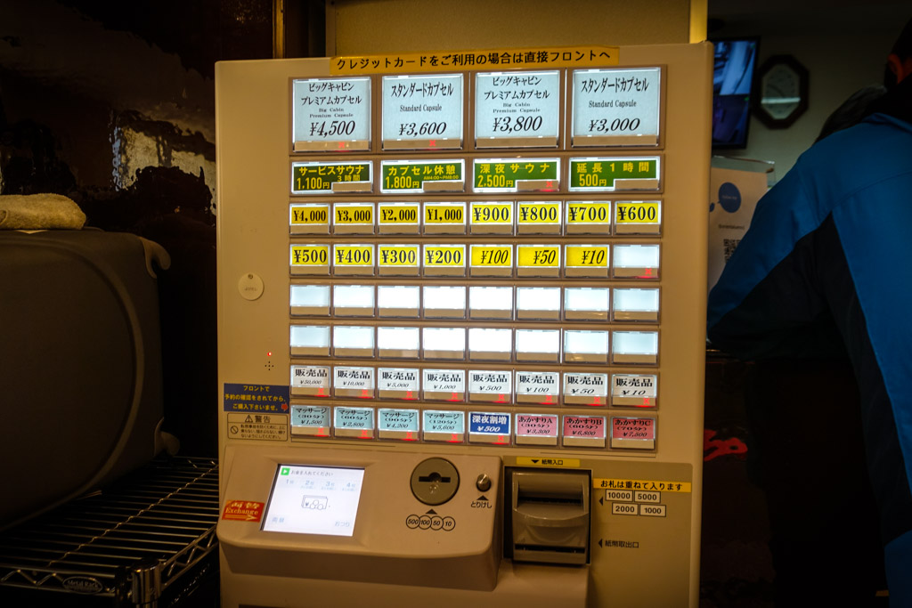 8. Очевидно, сотрудникам ресепшена не доверяют с наличкой, так что оплата производится вот в такой машинке. Сегодняшняя капсула стоит 2,500 иен, то есть около $23. Интересно, что такой кнопки на автомате нет, приходится оплачивать отдельно 2,000 и 500.