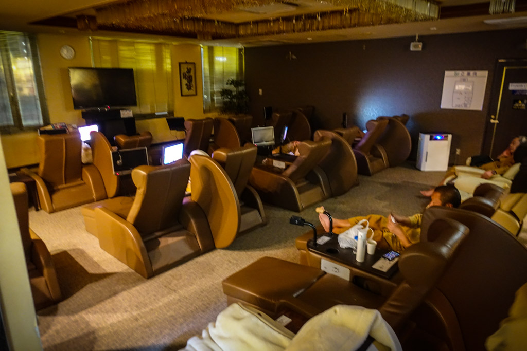 22. Если после парилки вам ещё неохота спать, то есть этаж с салоном. Тут можно устроиться поудобней, посмотреть телевизор, и даже покурить. С курением у японцев всё не как у людей. Они его запретили на улице, и разрешили в помещениях!