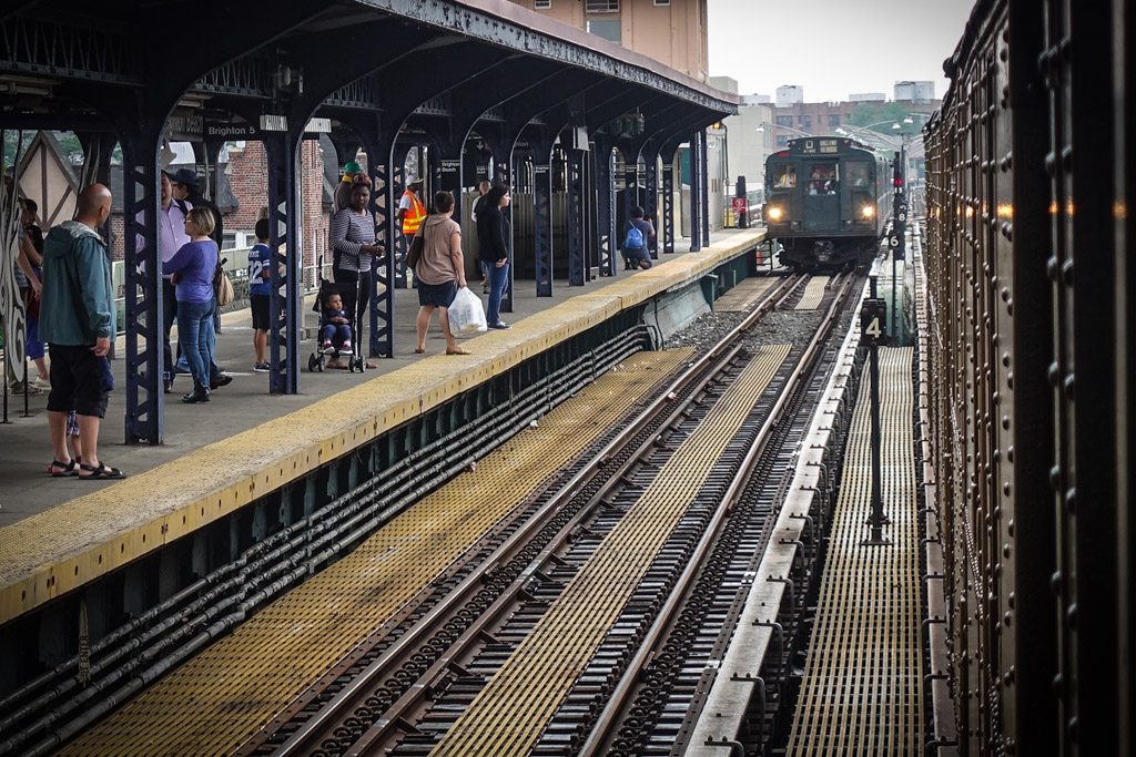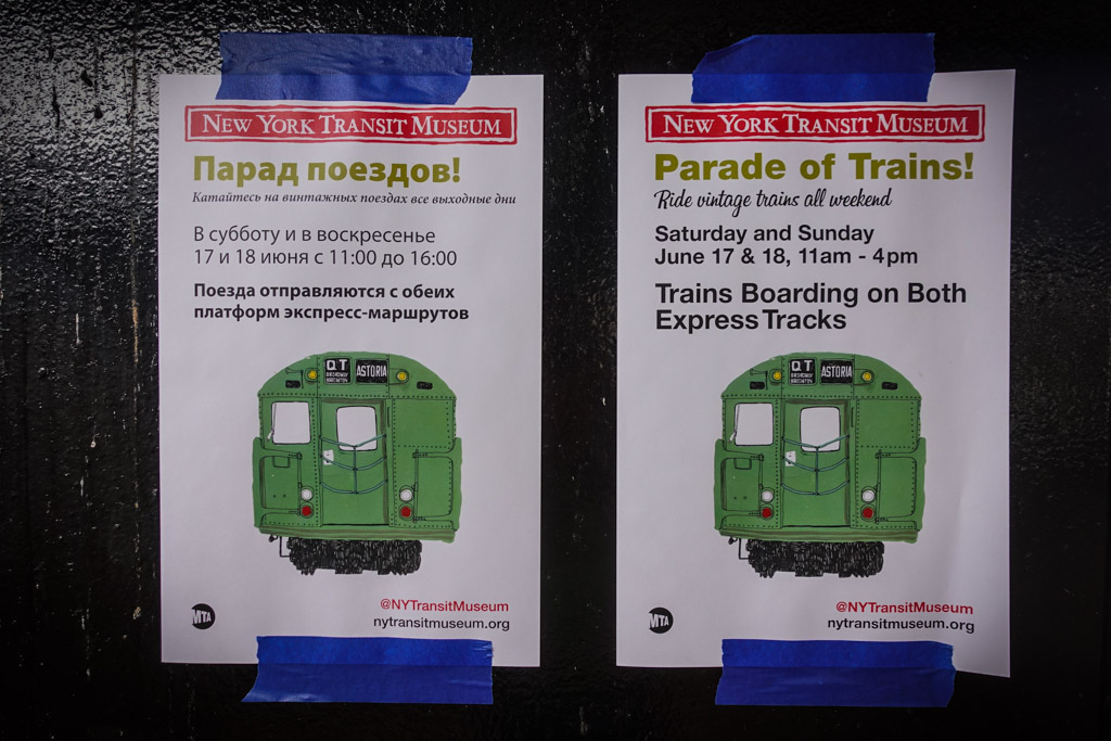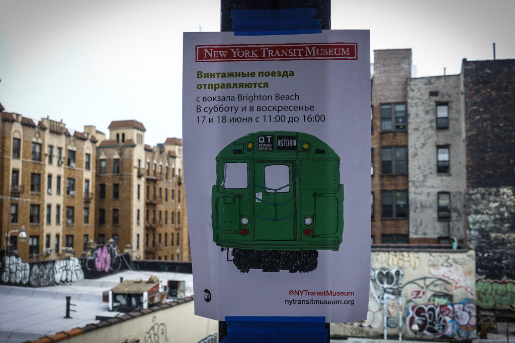 2. Объявления этого "Парада поездов" были расклеены на станции Brighton Beach Avenue. Там есть дублирующие пути по которым в будни ходят экспрессы - это позволяет наблюдать за людьми в соседнем составе. Однако по выходным экспрессов нет, так что музейщики спокойно могли гонять свои составы с этой станции не мешая обычной работе метро. Так как Брайтон, район, где великий могучий имеет далеко не последнее место, ребята продублировали объявления и на русском.