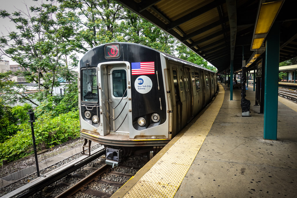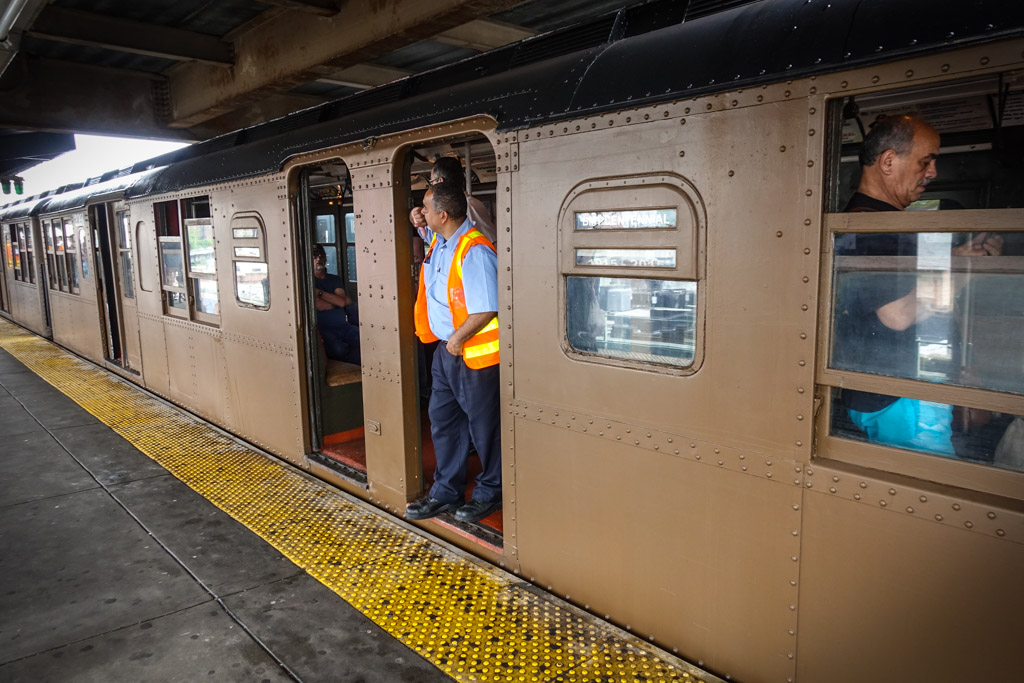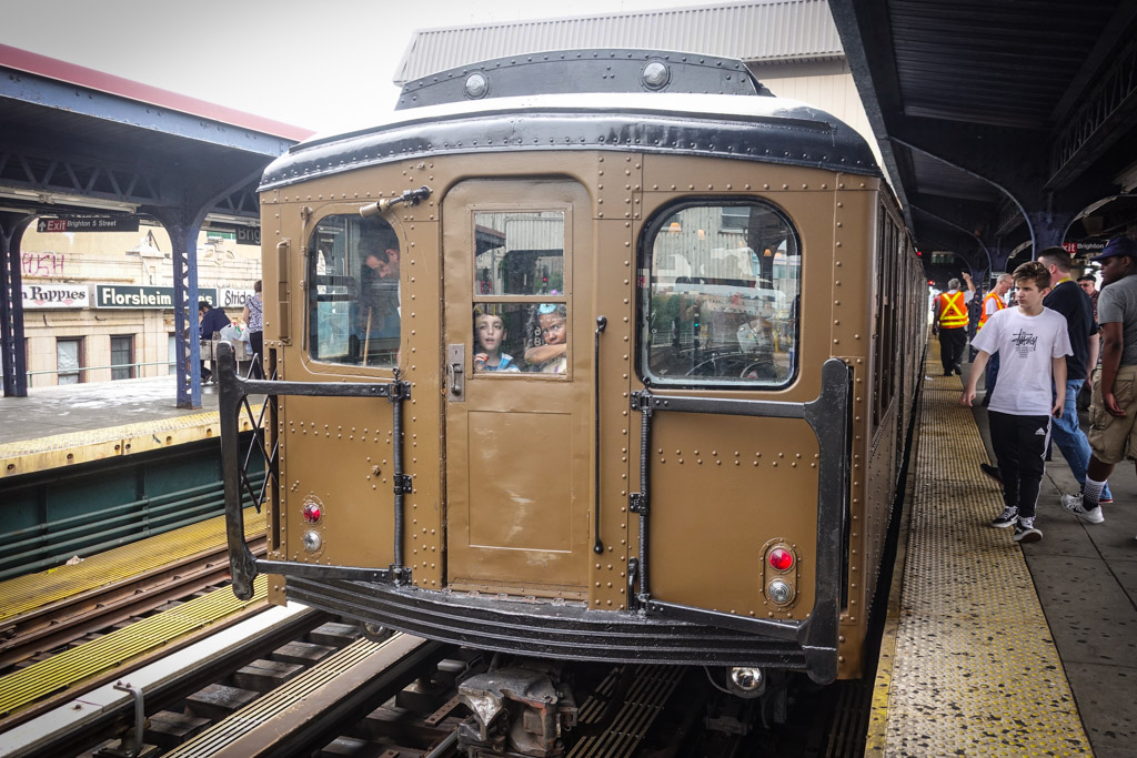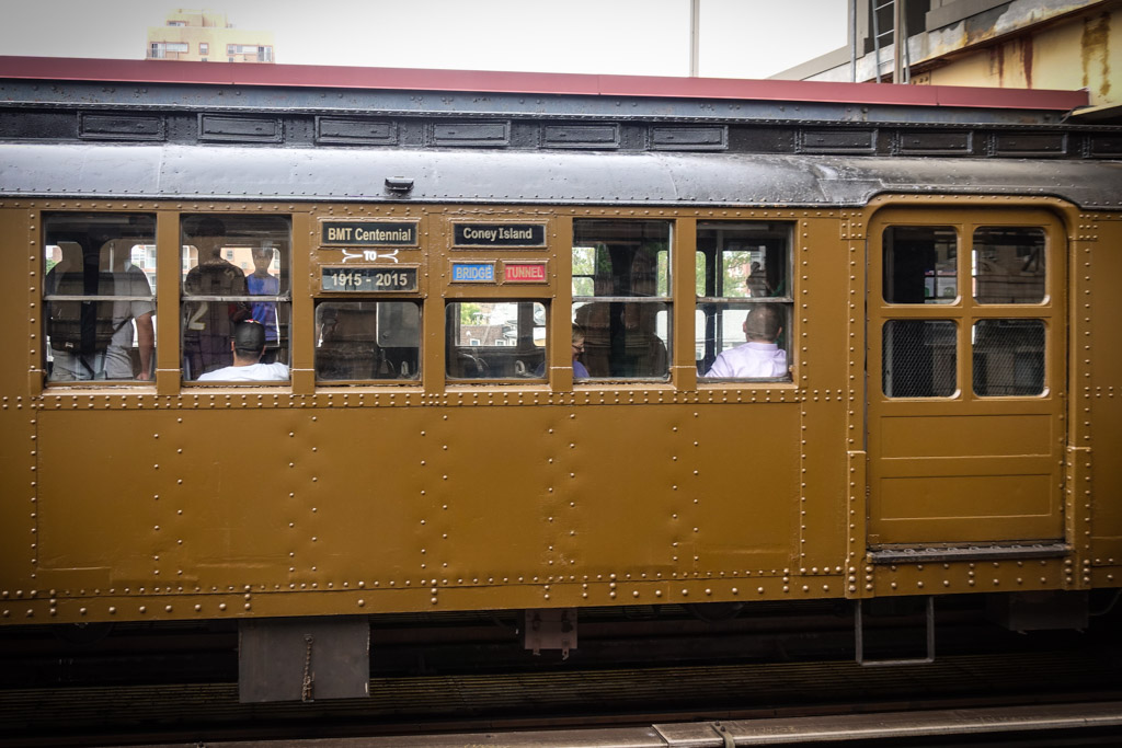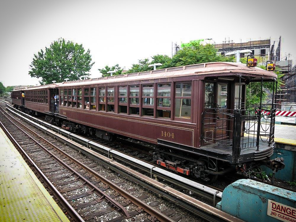 15. Был и четвёртый состав, но мне не удалось его сфотографировать, видел его лишь когда он мимо промчался, так что фотографию позаимствовал. Такие полуоткрытые вагоны использовались на возвышенных линиях (elevated railroad), которые не проходили по туннелям. Разумеется, в туннеле не особо приятно стоять на открытой платформе! Эти деревянные вагоны были построены в 1903 и 1907 годах, то есть поезду больше века. По-моему они чем-то напоминают знаменитый канатный трамвай в Сан Франциско.