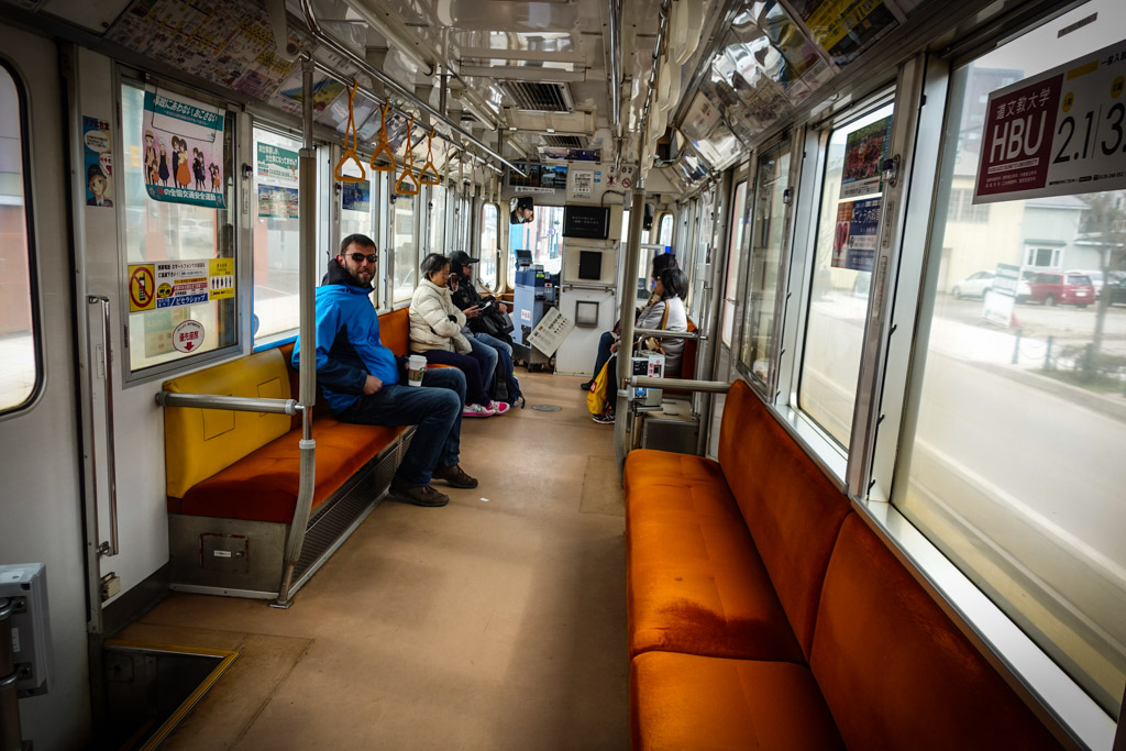 Вот салон хакодатского трамвая. Мы были тут в середине Апреля, и на Хоккайдо только начиналась весна. Было довольно холодно, так что обогреваемый салон трамвая пришёлся очень кстати!