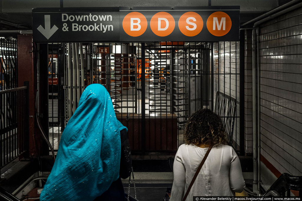Но приглядевшись, мы замечаем, что кто-то невнимательно повесил рекламу БДСМ прямо на виду у несовершеннолетних пассажиров. Как городские службы могли такое проглядеть?! Однако, человек хорошо знакомый с цветовой гаммой линий нашего метро знает - линия "S" не оранжевая, она серая, так как не проходит по манхэттенской авеню. Эта табличка фальшивая - её повесили какие-то шутники поверх настоящей, на которой написано "B/D/F/M". (Это тоже видно, если посмотреть внимательнее!) Так что Нью Йорк прекрасен ещё и тем, что здесь на каждом углу какие-то проявления творческого бунта.