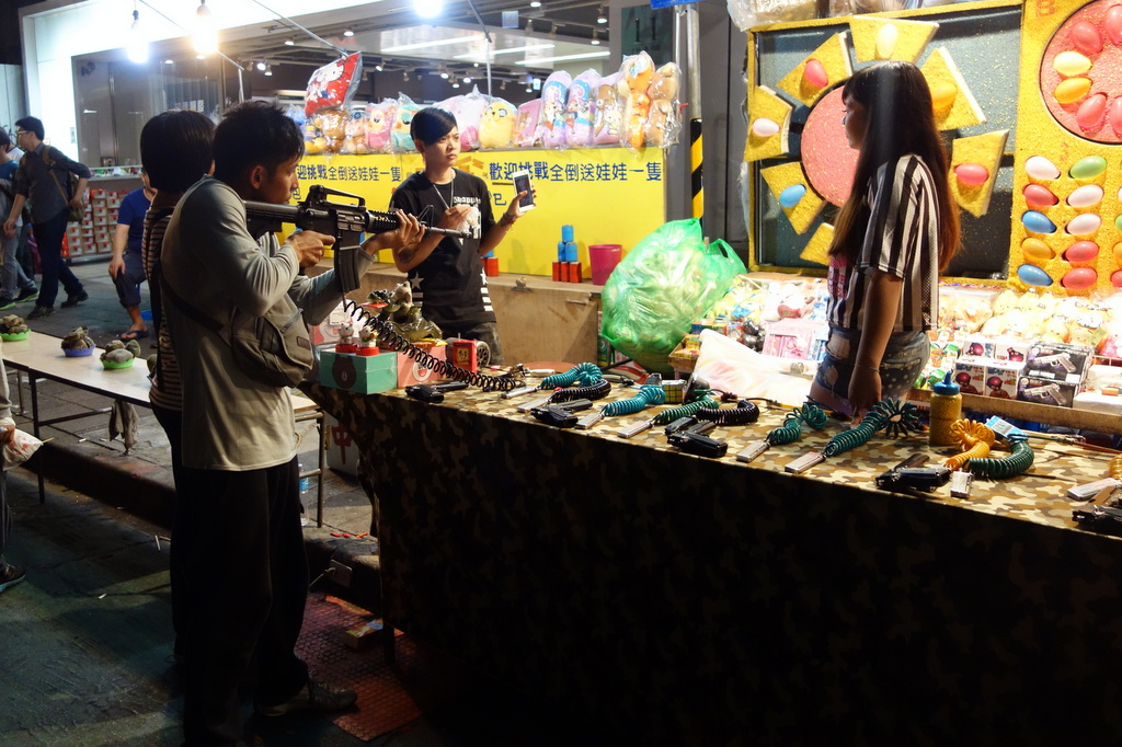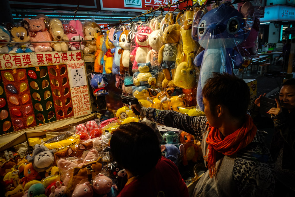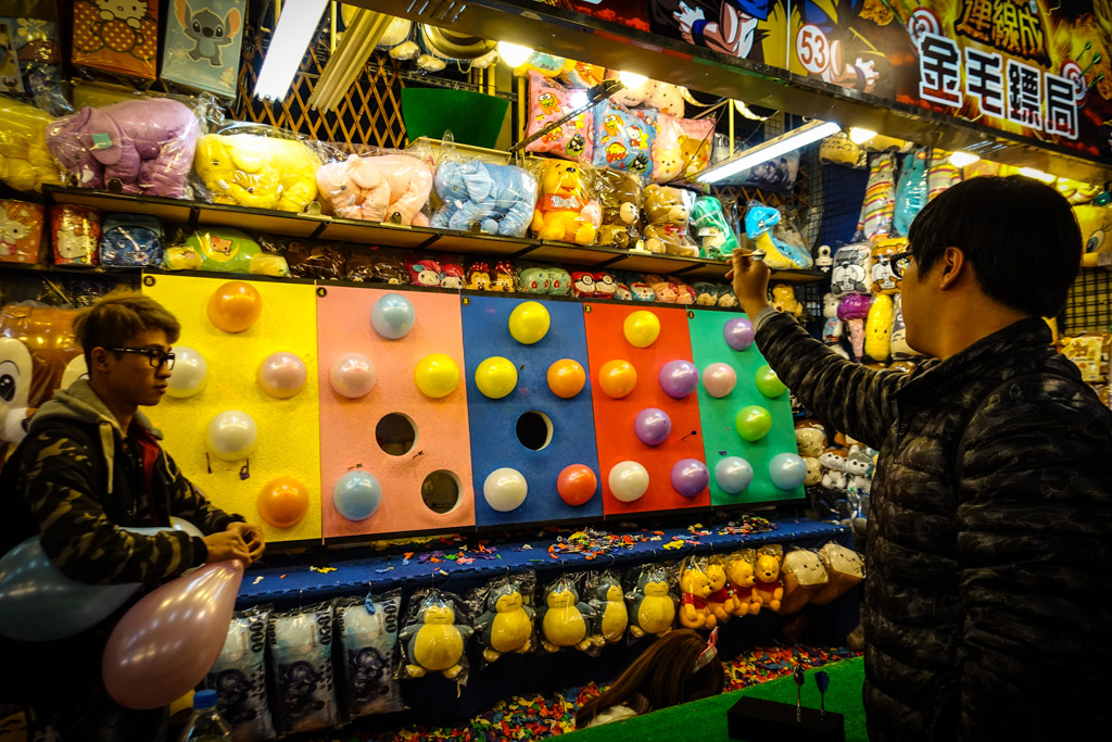 8. Но коль скоро большинство из посетителей тут местные, надо предоставить им возможность приятно провести время, и порадовать свою спутницу. Ради этого в таких рынках всегда есть огромное количество игр наподобие тира. Как правило играющий должен полопать все шарики в группе, чтобы получить огромного плюшевого зверя в подарок. Многие играют в эту игру дротиками.
