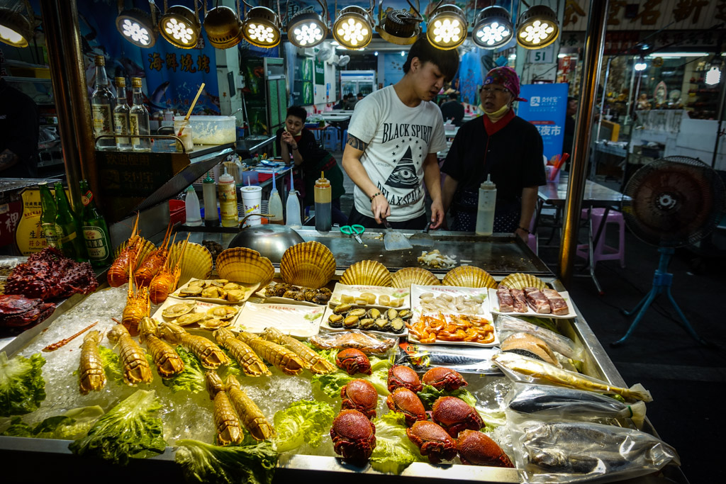 13. Всё же главная цель ходить на такие рынки - встретиться с друзьями и съесть какой-нибудь недорогой уличной еды. Китайские спальные районы не очень ярко подсвечивают, и ночной рынок становится явной, людной зоной притяжения пешеходов. Плюс, еда тут очень стоящая.