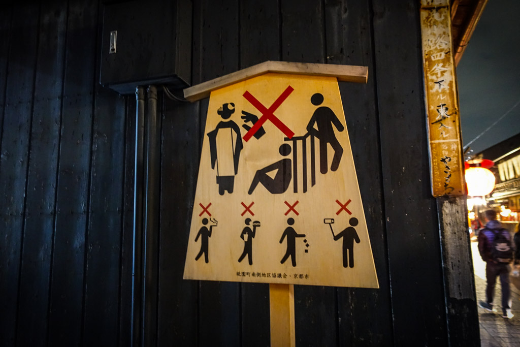 8. Знак в Киото: пожалуйста не трогайте руками Гейш. Это самое важное. Ещё много чего нельзя делать, но это уже не столь приоритетно (на улице запрещается курить, сидеть, есть, мусорить, и пользоваться селфификатором).
