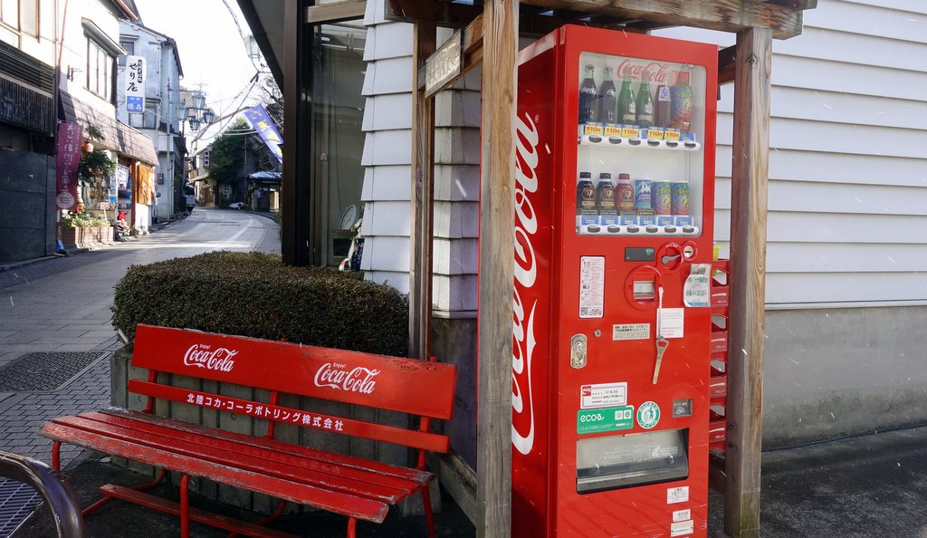 9. Повсеместные автоматы, продающие напитки - отличительная черта страны. Вот брендированный автомат по продаже Кока-Колы, с соответствующей скамеечкой рядом. Обратите внимание - в этой машине продают "классические" бутылки, поэтому на нём висит открывашка!