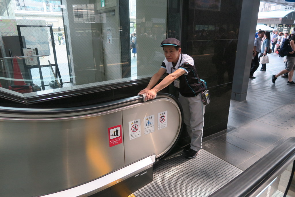 5. Но у японцев роботы выполняют далеко не все функции. Даже многую машинальную работу до сих пор делают люди. Вот например мойщик поручня эскалатора. Работа не очень подвижная - он просто стоит и держит тряпочку, а движущаяся резиновая лента протирает сама себя.