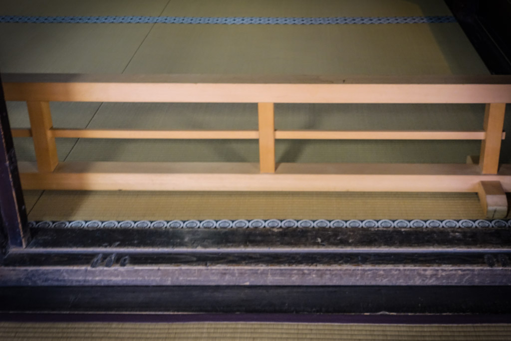 16. Вот тут виден вход в храм, который перекрыт деревянной оградкой, чтоб не заходили посторонние. На нижней части фотографии, снаружи, татами без узора. А на верхней, внутри помещения, видно, что на тесёмках есть более тонкие детали.