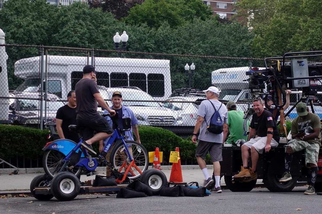 9. Киношники готовятся снимать, как человек едет куда-то на велосипеде из городского велопроката. Он будет сидеть в седле и крутить педали, а велосипед будут тянуть на буксире, чтоб не случилось ничего неладного. В Нью Йорке вообще много всего снимают для кино и телевидения.