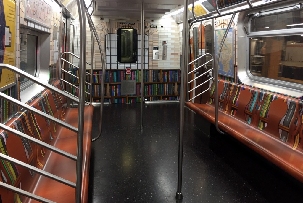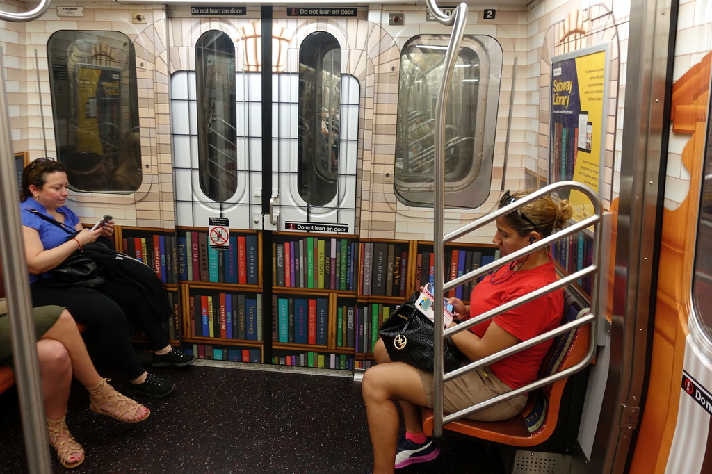 2. А ещё, в нью-йоркском метро протянули наконец вайфай и мобильную связь. Не в туннелях, конечно, а только на станциях, но это тоже неплохо. По этому поводу, метрошники запустили виртуальную Библиотеку Метро. Она позволяет читать книги через интернет на телефоне. Чтобы пиарить её, даже запустили особые рекламные составы. В метро Нью Йорка редко клеят рекламу снаружи вагонов, но тут решили, что для себя не жалко. Последний раз они так себя поздравляли, когда запустили кусочек новой ветки.