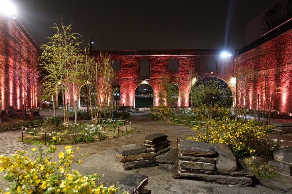 8. В Дамбо между двух мостов отреставрировали наконец остатки старого форта. Теперь здесь концертный зал, скверик, и красная подсветка ночью.