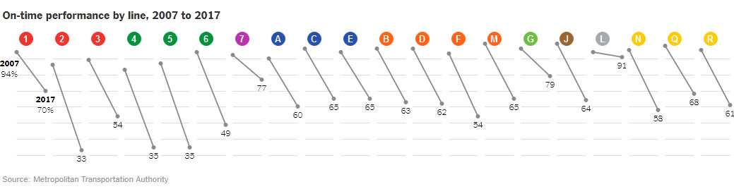 В итоге, за последние десять лет, процент составов метро, которые проходят весь маршрут вовремя, сильно упал на всех линиях системы: