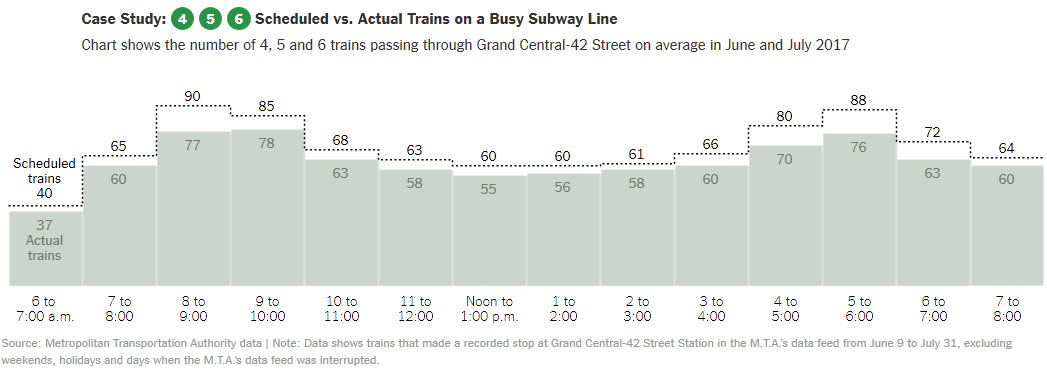 Более того, так как старые технологии не позволяют "уплотнять" расписание, метрошники вынуждены пускать меньше составов чем запланировано. Так, недавняя проверка New York Times показала, что на "зелёной" линии Лексингтон Авеню, в пиковый час с 8:00 до 9:00 утра проходит в среднем 77 вместо 90 поездов! То есть почти на 20% меньше положенного!