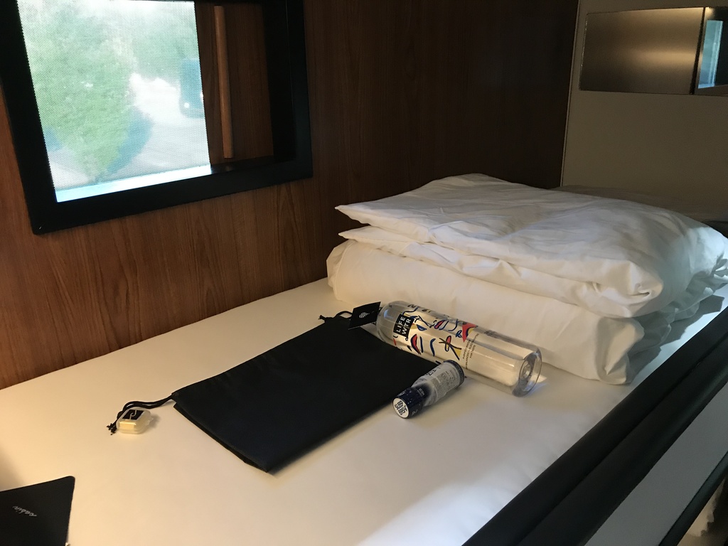 05. Внутри всё сделано в футуристическом стиле. У каждого пассажира тут своя "ячейка", они расположены в два яруса. Всё это чем-то напоминает мне капсульный отель в Японии.