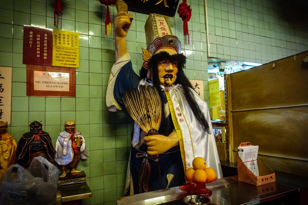 На стене храма висит инструкция по приношению жертв богу Вен Чану. Написано, что бог любит соевые бобы, зелёный лук, чеснок, сельдерей - всё это в малых количествах. А вот апельсинов он любит чтоб сразу пять было!