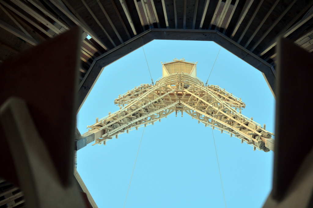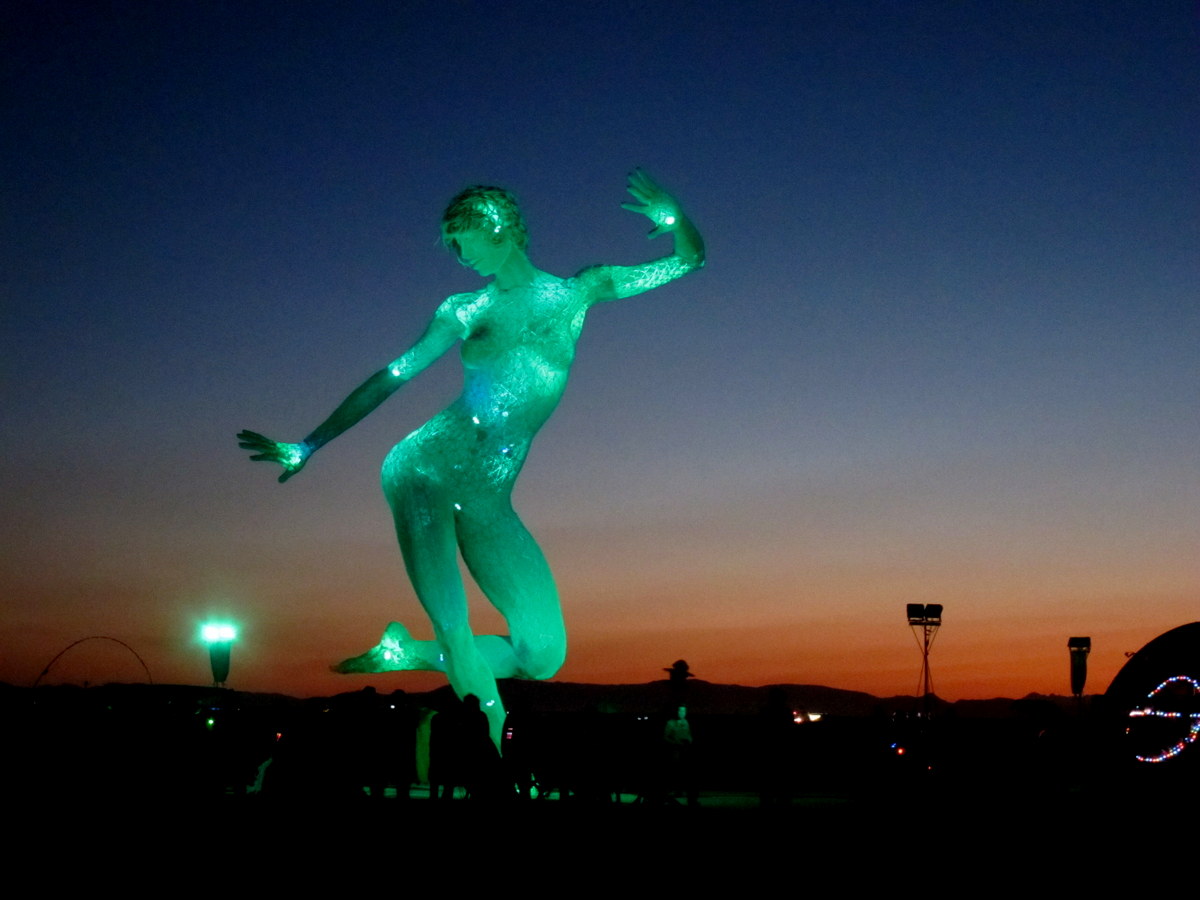 Первая: Вот, собственно сам Мэн, с необычного ракурса снизу. Это здоровая деревянная фигура символизирующая власть и авторитет. В конце недели её сожгут. В прошлом году тема фестиваля была "Мастерская ДаВинчи", так что Мэн был в образе витрувианского человека. По задумке он должен был крутиться, но что-то пошло не так.