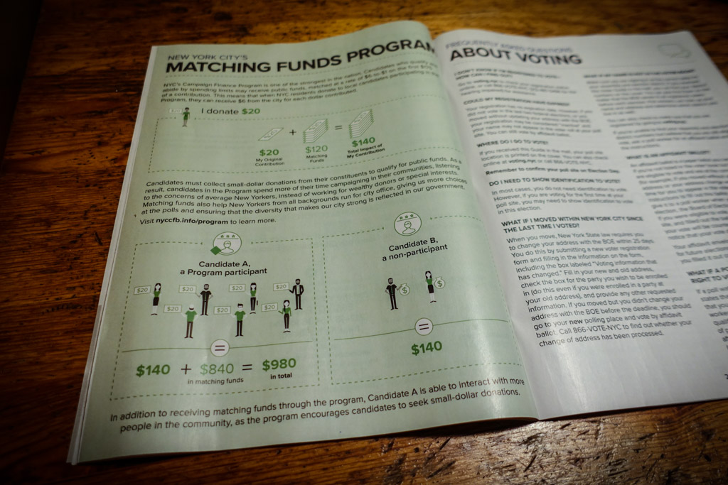 6. А потом перевернул страницу, а там всё объясняют. Оказывается, в Нью Йорке есть прекрасная программа общественного финансирования политических кампаний! Работает это так: кандидат, который удовлетворяет все требования этой программы получает от городского бюджета шесть долларов за каждый один доллар, полученный в виде небольших (до $175 с человека) частных пожертвований. То есть, дал Вася Пупкин своему кандидату $175, а город добавляет ещё $1050 - и в сумме у того уже $1225 на избирательные нужды!