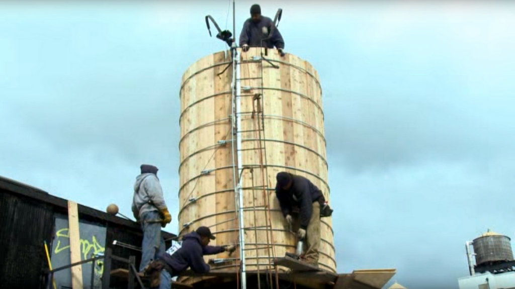 Их мастера не забыли о бочках своих предков. Как и былые бондари, они собирают эти башни из досок, в основном с помощью ручного инструмента, и не используют никаких смазок или клея для того, чтобы сделать их герметичными. Да они сначала и не герметичные! Сразу после завершения, эти башни пропускают воду через все стыки. Но вскоре дерево набухает от влаги, и бочка башни сама-собой закупоривается.