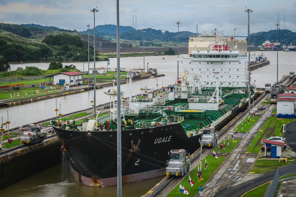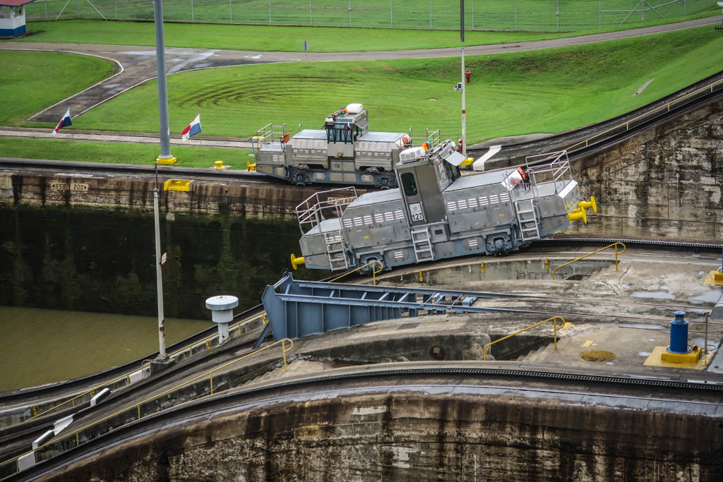 Как написали многие в комментариях, шлюзы канала настолько узки, по сравнению с огромными грузовыми кораблями, которые через них проходят, что часто между бортом судна и стенкой шлюза остаётся меньше метра. В таких условиях капитанам запрещают заводить моторы, и суда протягивают железнодорожными буксирами.