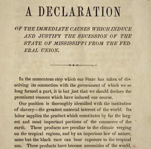 В виду серьёзного шага, который наш Штат предпринял, разрывая свои связи с правительством, частью которого мы так долго являлись, было бы лишь справедливо огласить важные причины, которые привели нас к этому курсу действий.