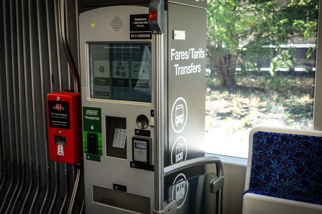 6. Внутри трамваев находится кассовый аппарат - тут продаются билеты и пополняются проездные. К сожалению для оплаты он принимает только монеты или кредитки с бесконтактной оплатой (у меня таких нет, так что пришлось выскребать все монетки). Цена проезда $3.25 за один билет (канадские доллары), или $9.00 если брать срезу три жетона впрок. Ещё есть недельные и месячные проездные.